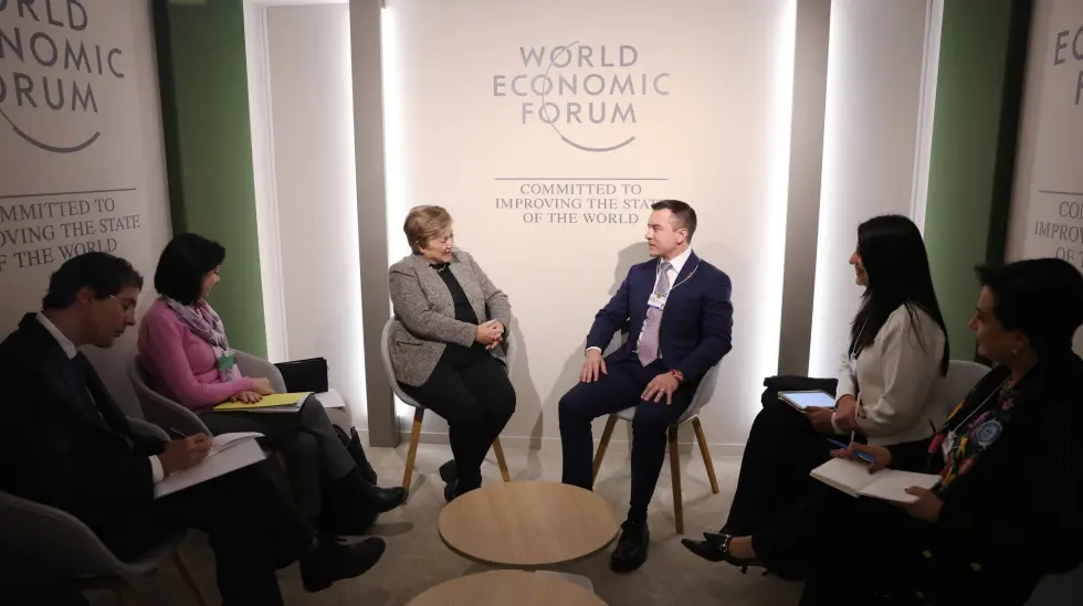 Noboa también se reunió con Kristalina Georgieva, directora gerente del Fondo Monetario Internacional (FMI). En el encuentro, se revisaron los avances del Ecuador en materia de estabilidad macroeconómica, destacando la reducción del riesgo país, el fortalecimiento de las reservas internacionales y recuperación de la confianza de los mercados internacionales.